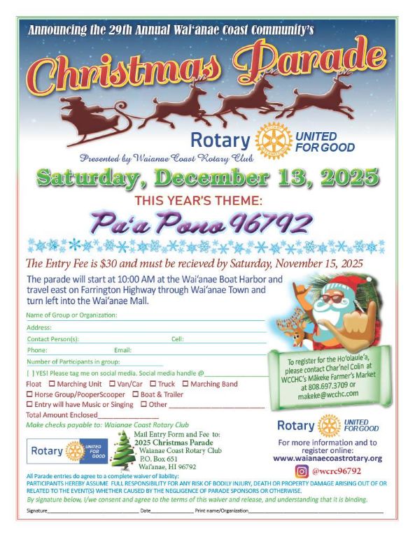 On the Waianae Coast, our Rotary Club continues that legacy with deep roots in community connection. Chartered in 1969, the Waianae Coast Rotary Club has served generations through initiatives that uplift youth, honor kupuna, and celebrate the culture and resilience of our coast. We proudly organize the annual Waianae Coast Rotary Christmas Parade, a beloved tradition since the 1950s, and support scholarships, literacy programs, and partnerships that strengthen families and promote unity throughout the 96792 community.